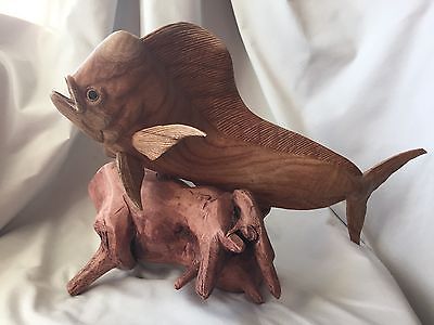 Title (ebay affiliate link): Hand Carved Wood Mahi Mahi Fish with Wood Stand 16" x 11"