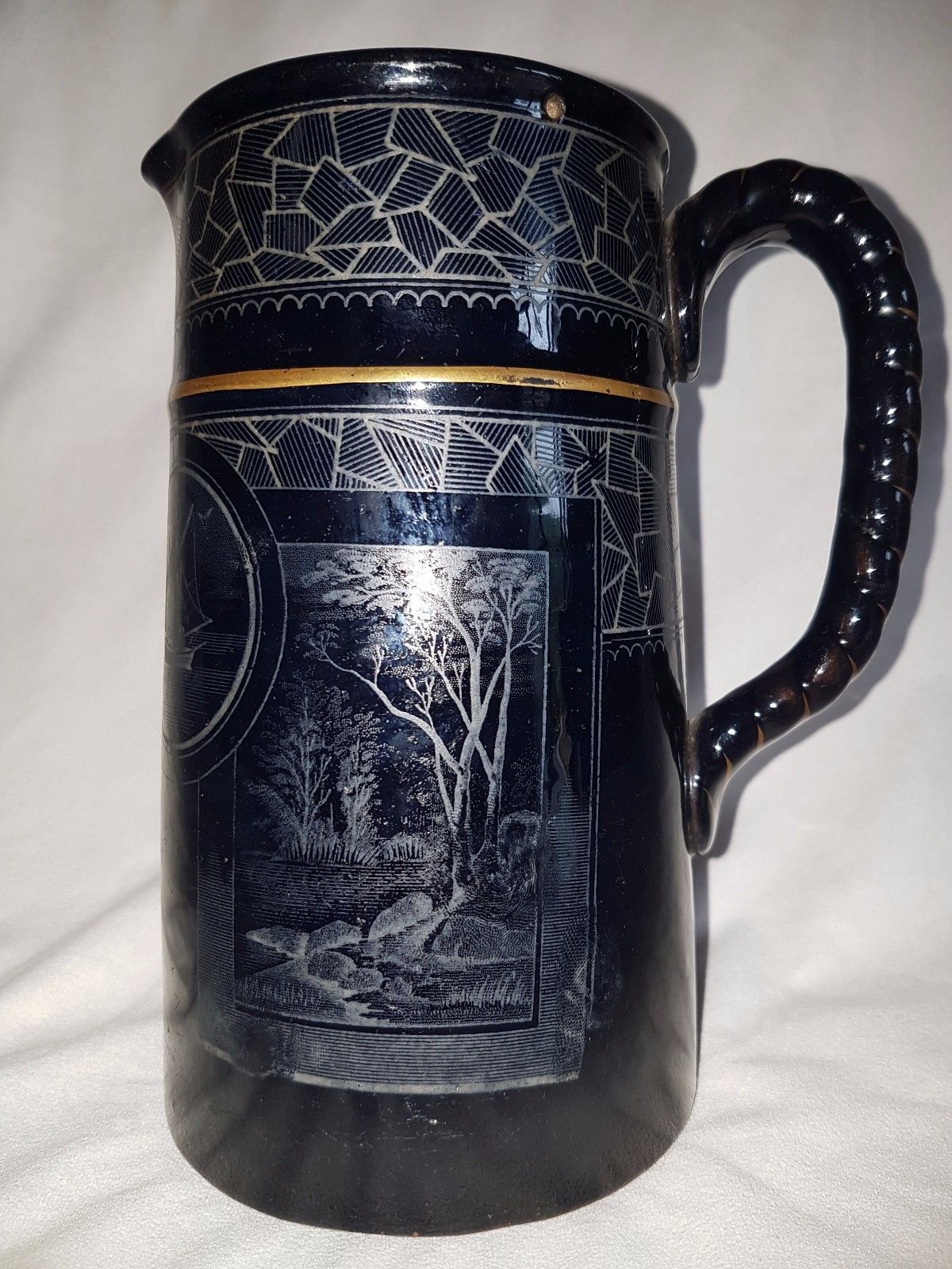 Title (ebay affiliate link): c.1870's - Antique Jackfield Barge ware jug black with gilt and cameos to outer