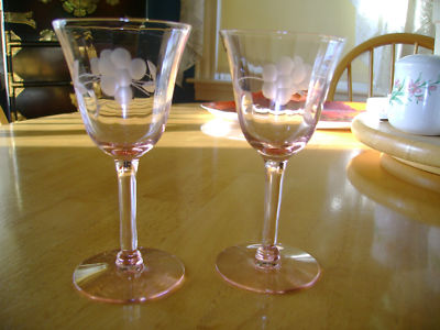 Title (ebay affiliate link): 2 Pink Floral Etched Depression Stem Cordial Wine Glass