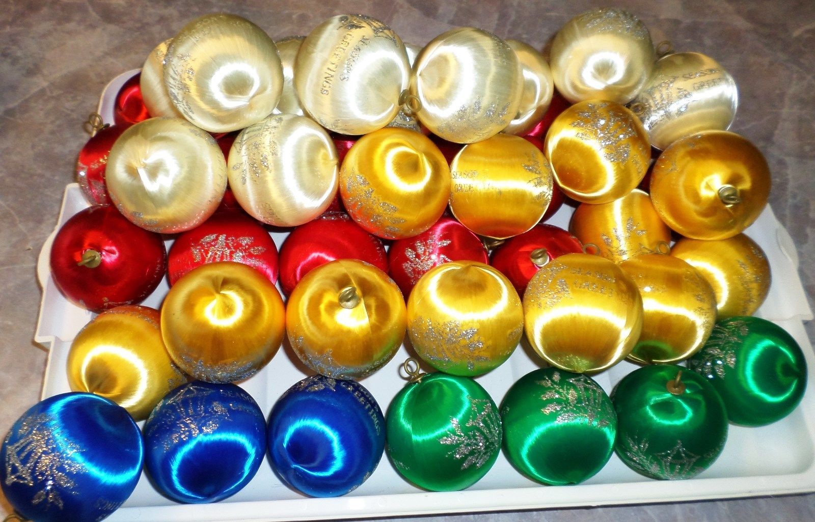 Title (ebay affiliate link): Lot Vintage Satin Ball Ornaments Stenciled Glitter 49 Green Red Gold White Blue