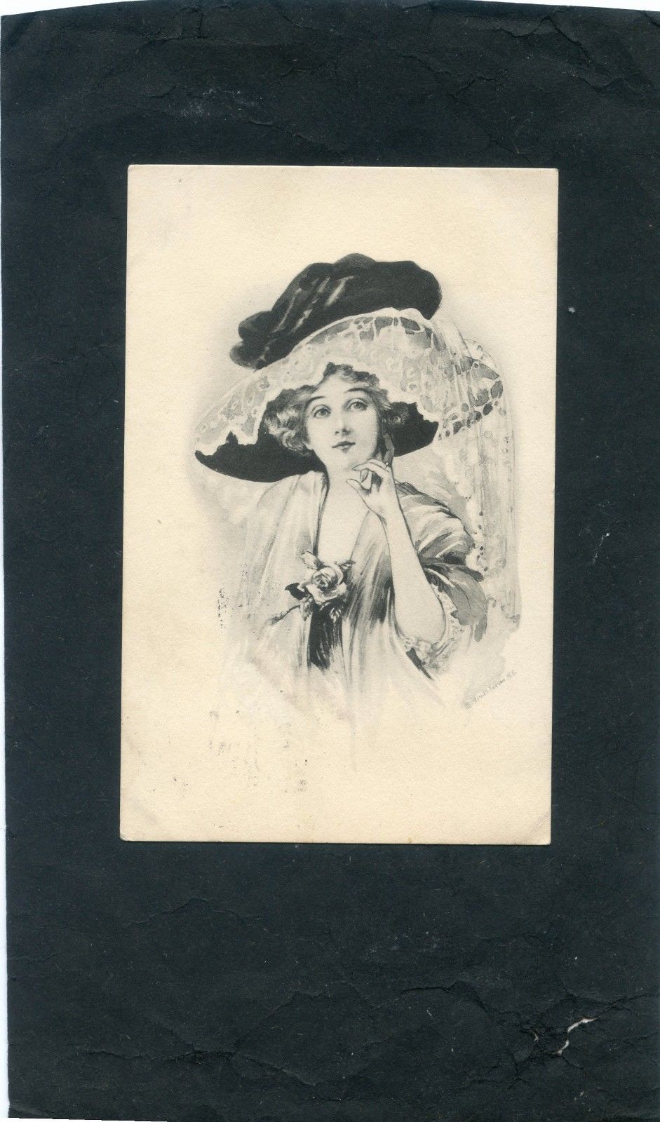 Title (ebay affiliate link): Pretty lady & large hat, 1910's b&w artist signed postcard that is hard to read