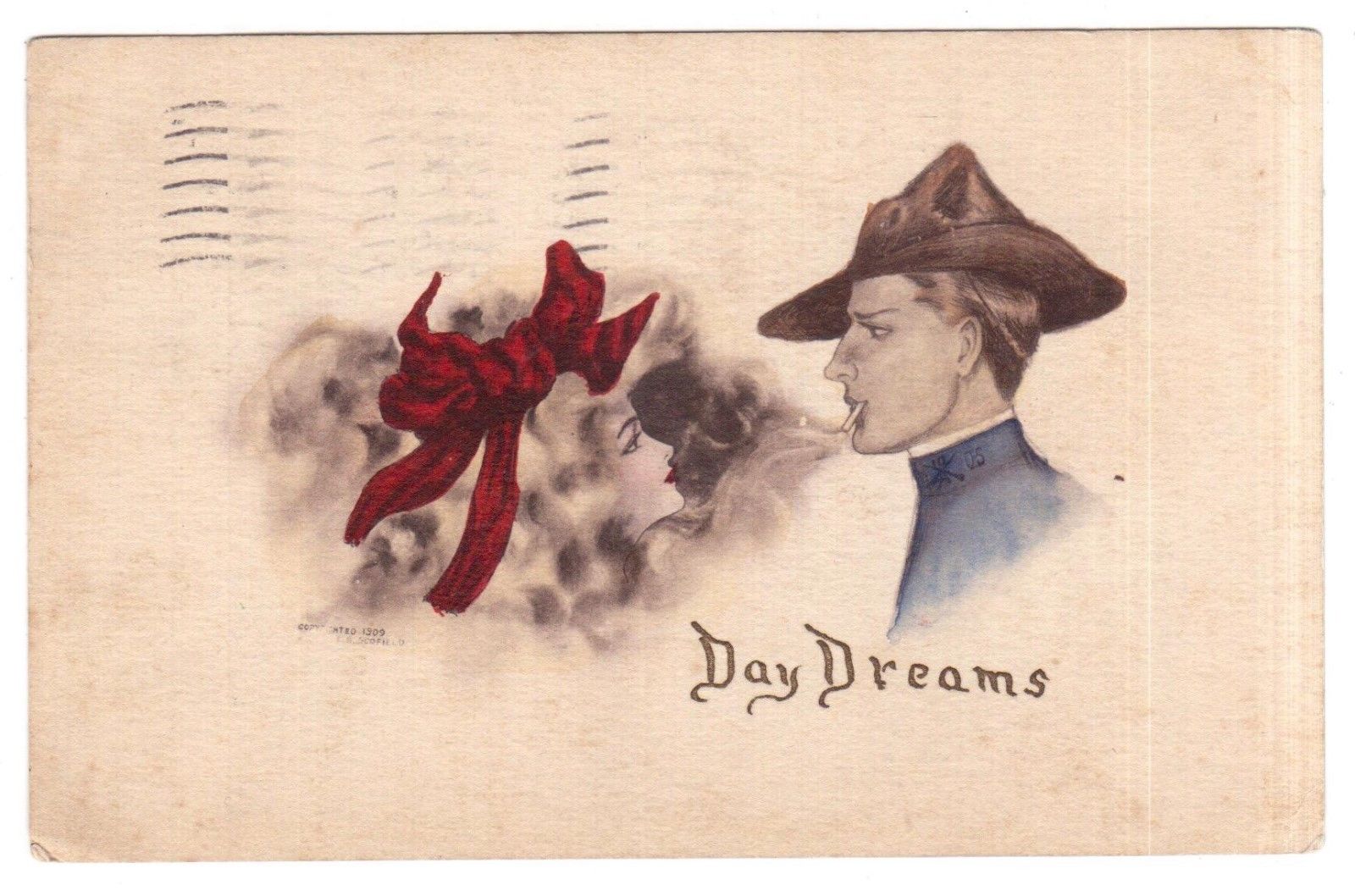 Title (ebay affiliate link): ANTIQUE 1909 DAY DREAMS U.S. SOLDIER SEES HIS GIRL IN CIGARETTE SMOKE FANTASY PC