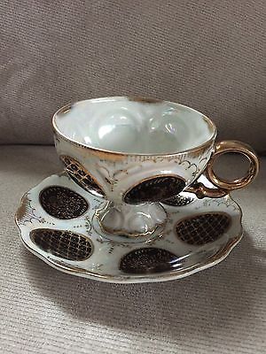 Iridescent Cup and Saucer White with Black and Gold