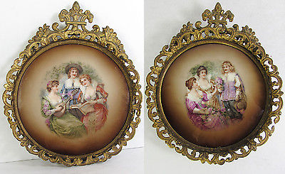 Antique Pair Miniature Transfer on Porcelain FILIGREE Brass Framed Plaques