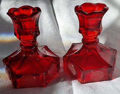 Vintage Pair Of Red Coin Glass Candle Holders, 4 1/2 Inches Tall, Fostoria
