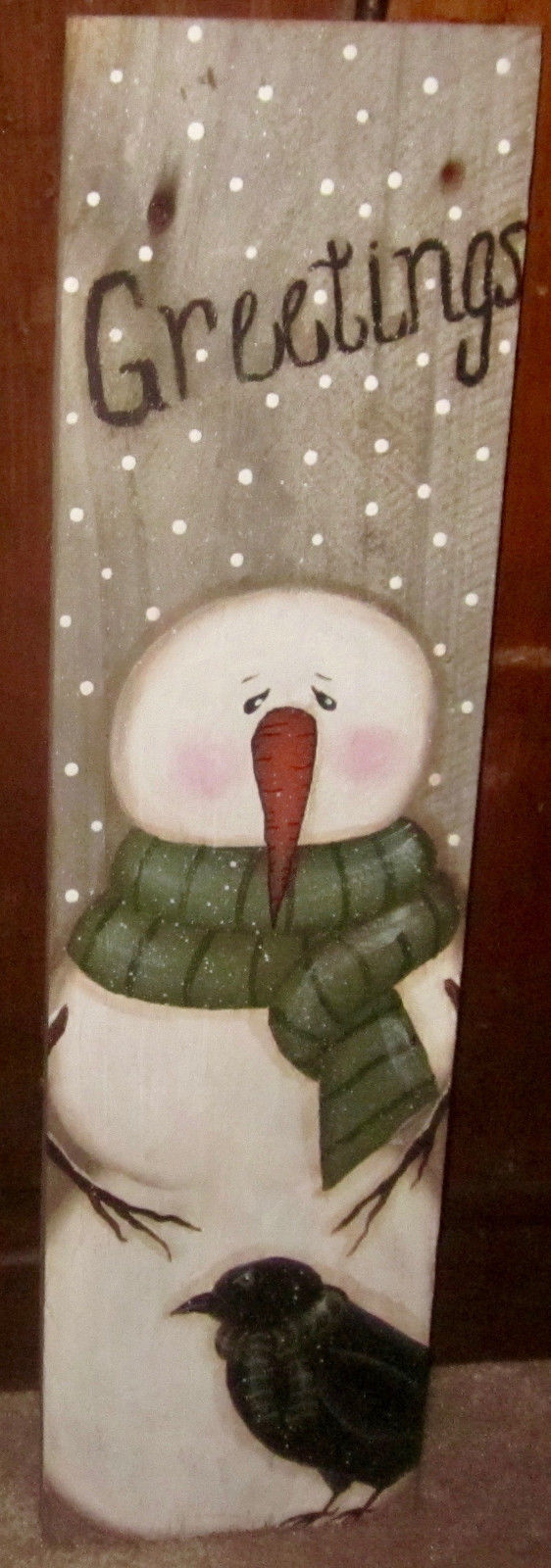 *~*PRIMITIVE*~* HP FOLK ART SNOWMEN * CROW * GREETINGS *~* OLD RECLAIMED WOOD