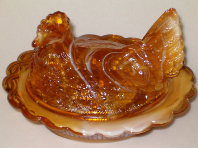 AMBER & MILK SLAG GLASS HEN CHICKEN ON NEST BASKET DISH