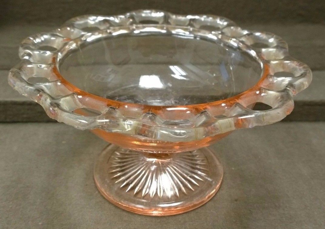 Title (ebay affiliate link): Antique Pink Glass Compote Candy Dish with Pierced Edge 3-1/2" x 6-3/4"