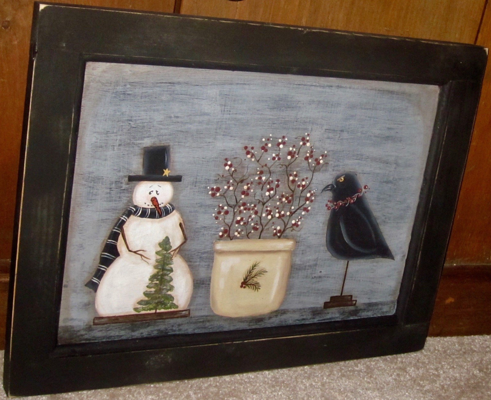 Title (ebay affiliate link): *~*PRIMITIVE*~* HP FOLK ART PRIM WINTER GATHERING * SNOWMEN *CROW *~* DOOR PANEL