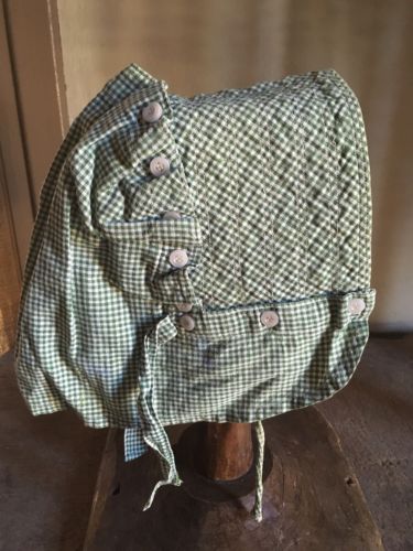 Title (ebay affiliate link): Antique Green & Cream Homespun Handmade Child's Prairie Farm Bonnet Textile AAFA