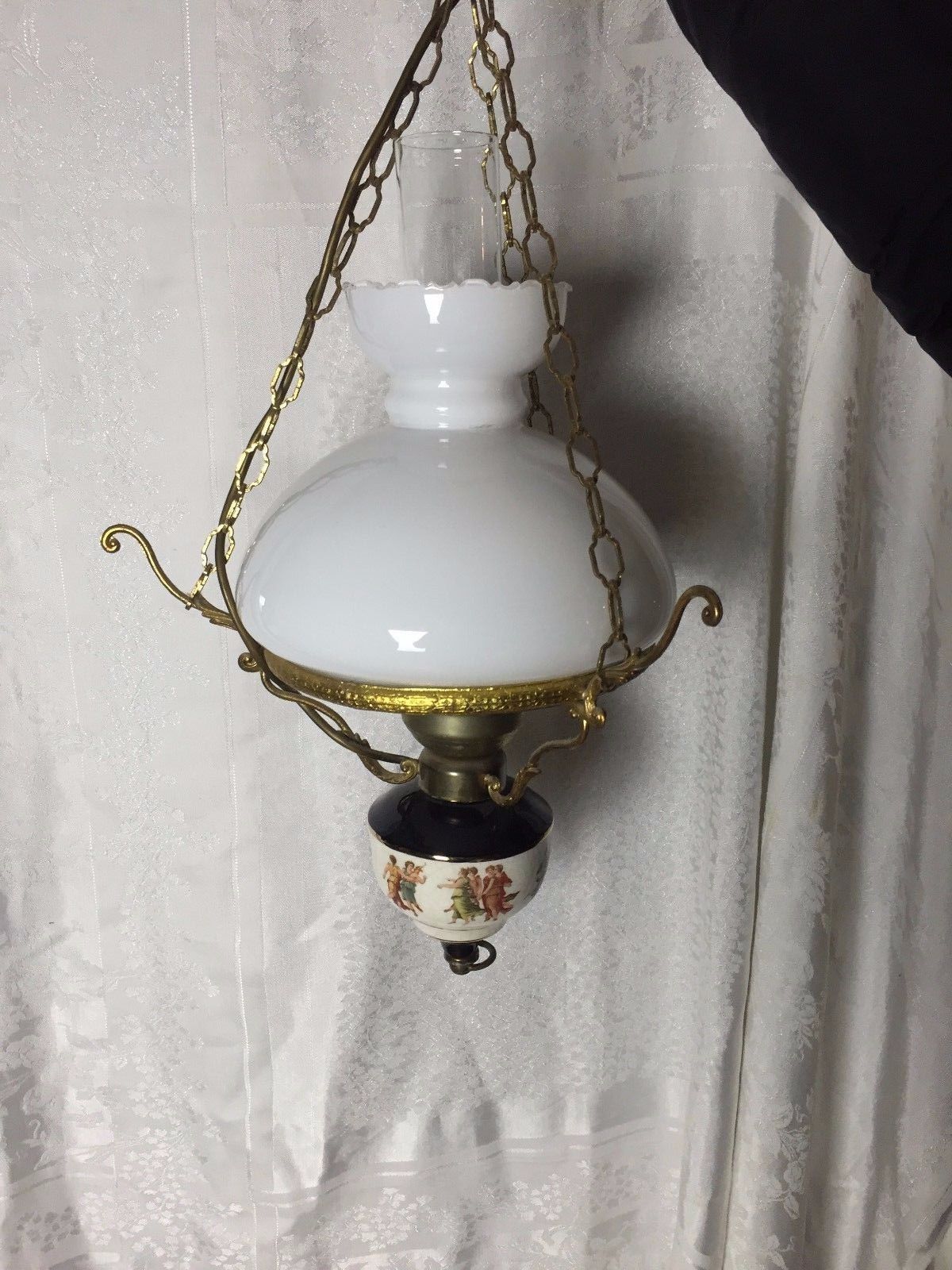 Title (ebay affiliate link): PAIR VINTAGE BRASS HANGING ELECTRIC OIL LAMP STYLE PORCELAIN CRACKLE BASE ROMANS