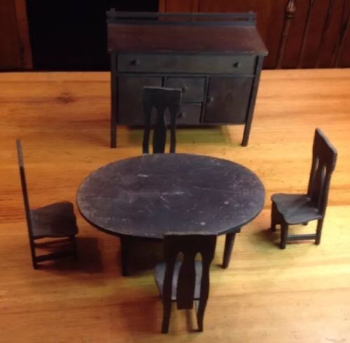 Title (ebay affiliate link): ANTIQUE HANDMADE WOODEN DOLLHOUSE FURNITURE DINING TABLE 4 CHAIRS & SIDE CABINE