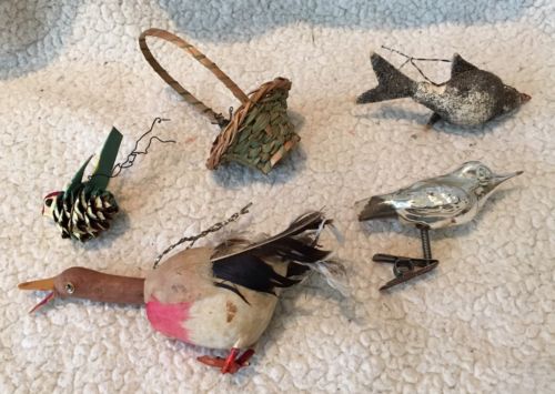 Title (ebay affiliate link): Antique Lot: Mica Glass Pinecone Nodder Feather Bird Basket Ornaments