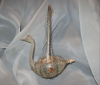 Vintage / Antique Hand Blown Frosted Glass Swan Christmas Ornament w/ Wire Net