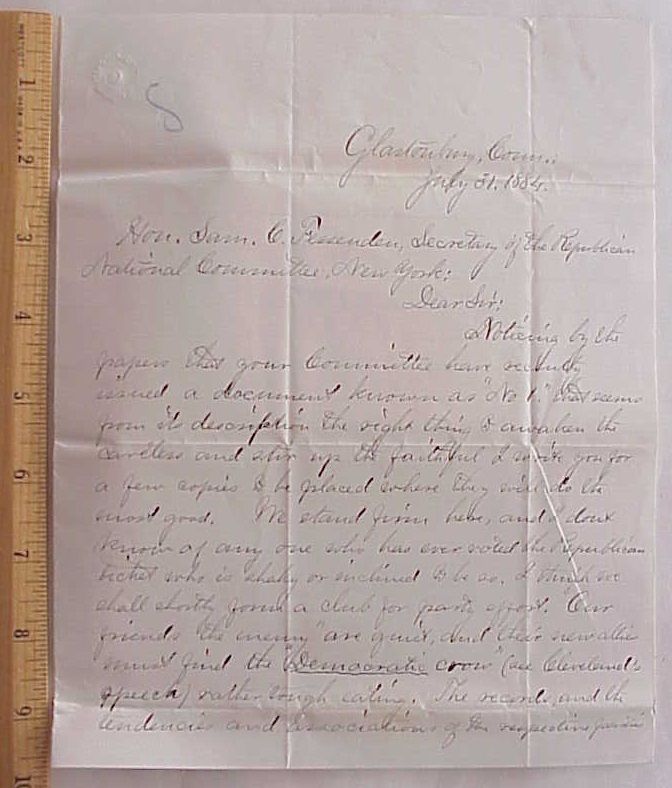 Title (ebay affiliate link): 1884 Blaine-Logan Campaign Letter Glastonbury CT William S. Goslee