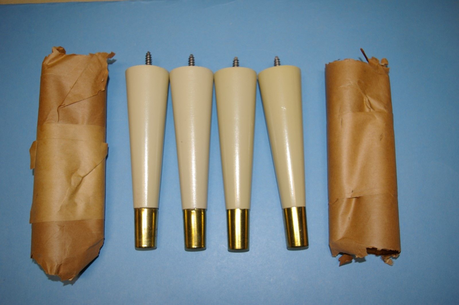Title (ebay affiliate link): NOS Set of 4 Mid Century Table Legs 6 5/8" Wood Tapered Brass Tips Vintage