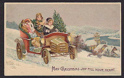 Christmas-Car-Children-Dolls-Tree-Snow-Embossed Antique Postcard