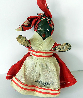Vintage Antique Compostion Doll*Black Mammy Doll*Red Dress*Hat*White Apron*4"