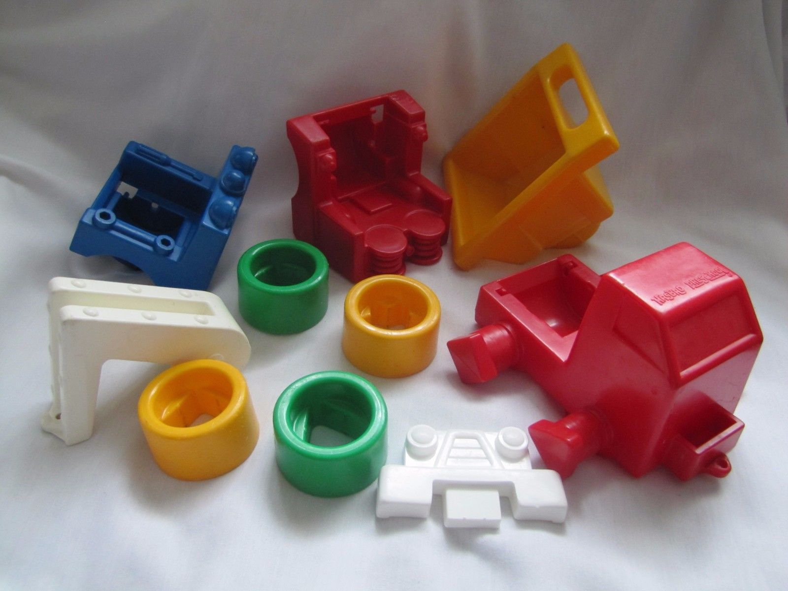 Title (ebay affiliate link): Vtg 1979 Romper Room SHAPE MATCHERS Take Apart Build Tow Fire Dump Trucks HASBRO