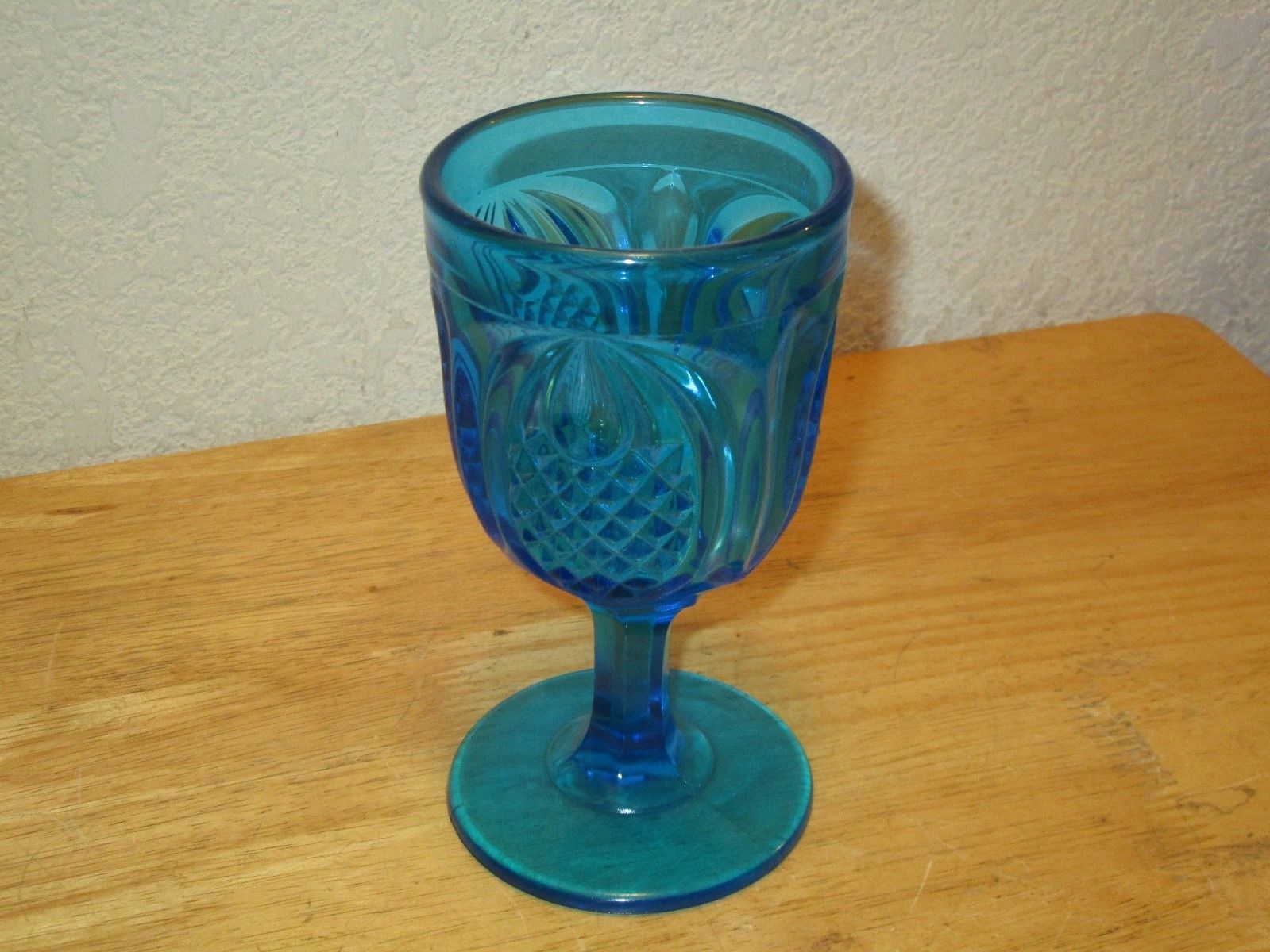 Title (ebay affiliate link): Vintage Blue Etched Depression Glass Goblet 6" tall