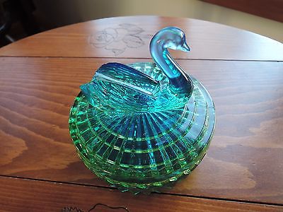 Title (ebay affiliate link): Jeanette Glass swan topped powder and lipstick trinket dish-blue green