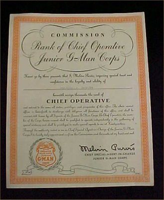 Title (ebay affiliate link): Vintage Melvin Purvis Junior G-Man Corps Certificate Rank of Chief Operative