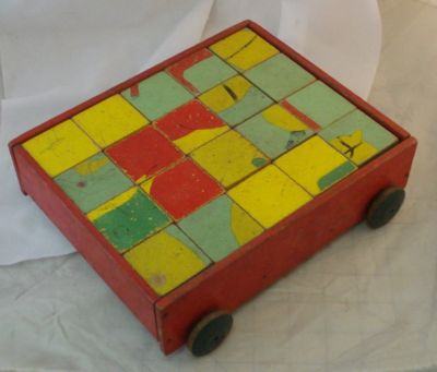 vintage wooden puzzle wagon, 1930's 4 puzzles in wagon