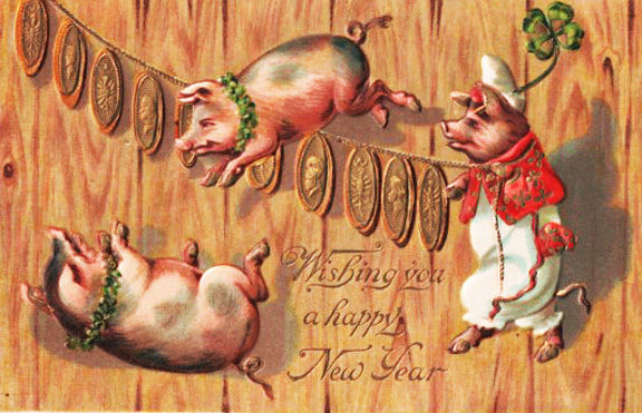 Title (ebay affiliate link): LAVISH GOLD EMBEL. TO DRESSED PIGS JUMPING New Year Lucky Coin ROPE ~ FUN IMAGE!