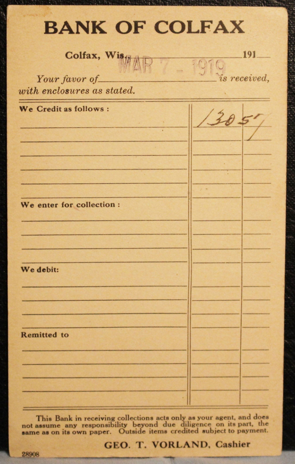 BANK OF COLFAX WISCONSIN 1919 POSTCARD