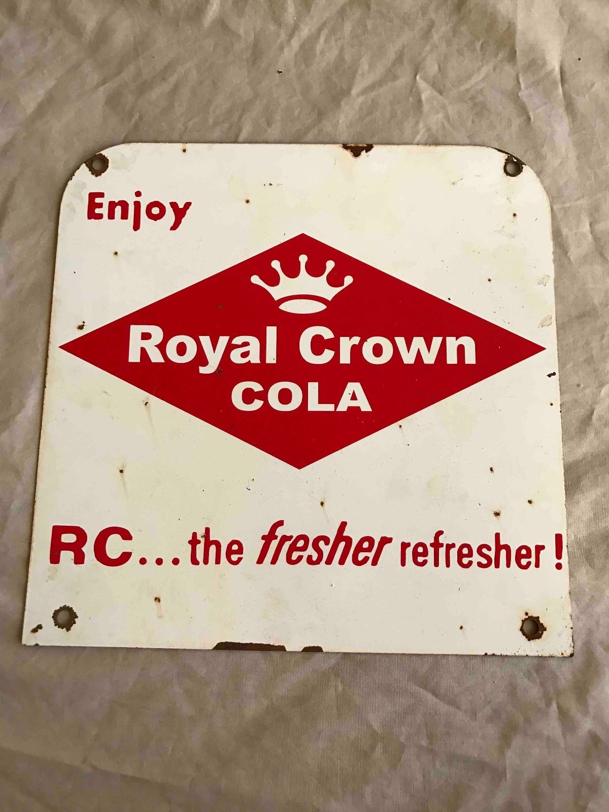 Title (ebay affiliate link): Vintage Enjoy Royal Crown RC Cola Soda 6 Pack Sales Rack Advertising Sign