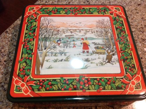 Title (ebay affiliate link): Vintage "Christmas Cards", Cookies, Biscuit Tin Box 9.25x 8.75" Massilly France