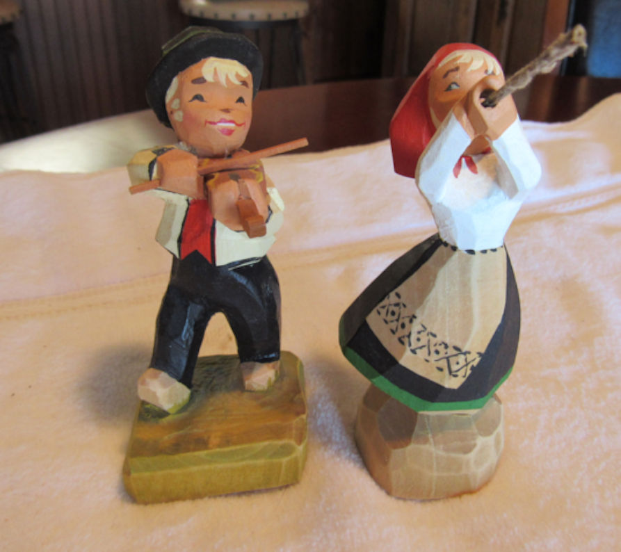 Lot 2 HENNING Hand Carved Wood Figurines Boy with Violin + Girl
