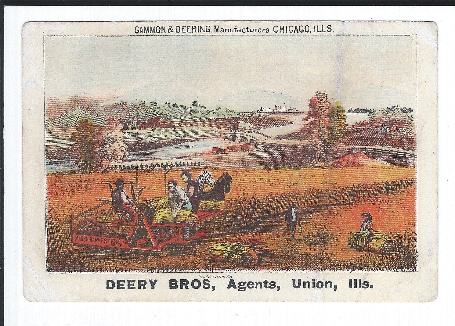 Gammon & Deering MARSH HARVESTER Early c1872 Union Litho Illinois Trade Card