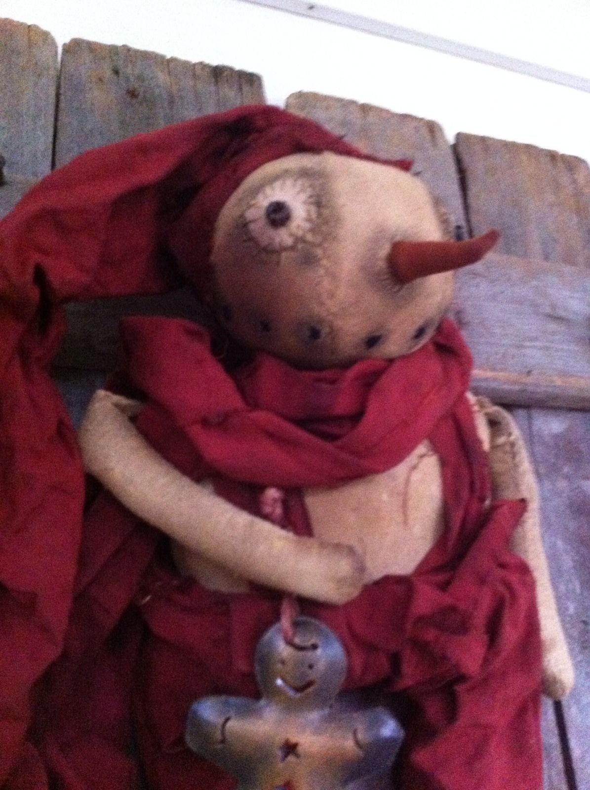 Title (ebay affiliate link): Primitive folk art All Hand stitched Snowman Doll with his Gingerbread ornament