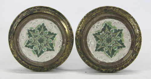 2 Antique 1880s Victorian Primitive Green Sulphide Glass Curtain Tie Backs 1 yqz