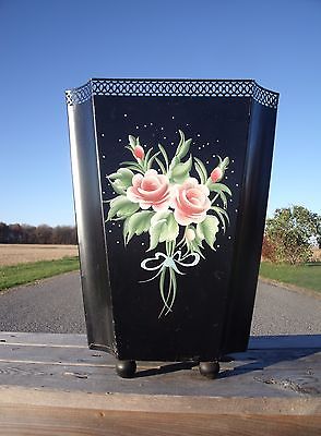 FAB! vtg Hand Painted TOLE WARE BLACK METAL TRASH CAN WASTE BASKET ROSES W/FEET