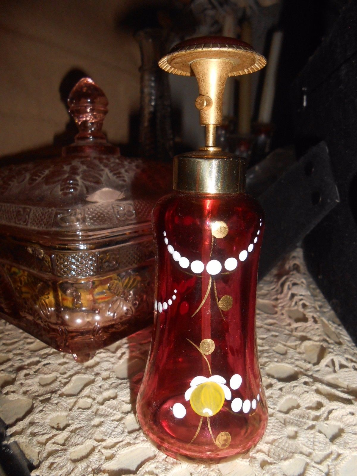 Title (ebay affiliate link): 1900-1940 Art Deco Cranberry Glass Perfume Atomizer Bottle Made in West Germany