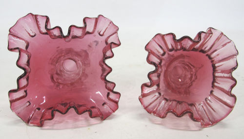 2 Vintage Crimped Epergne Centerpiece Vase Cranberry Art Glass Horn Inserts yqz