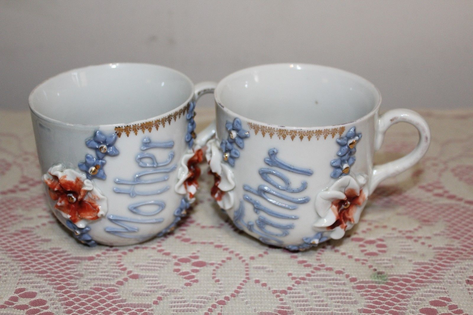 MOTHER & FATHER CUPS/MUGS RAISED PORCELAIN FLOWERS GERMANY