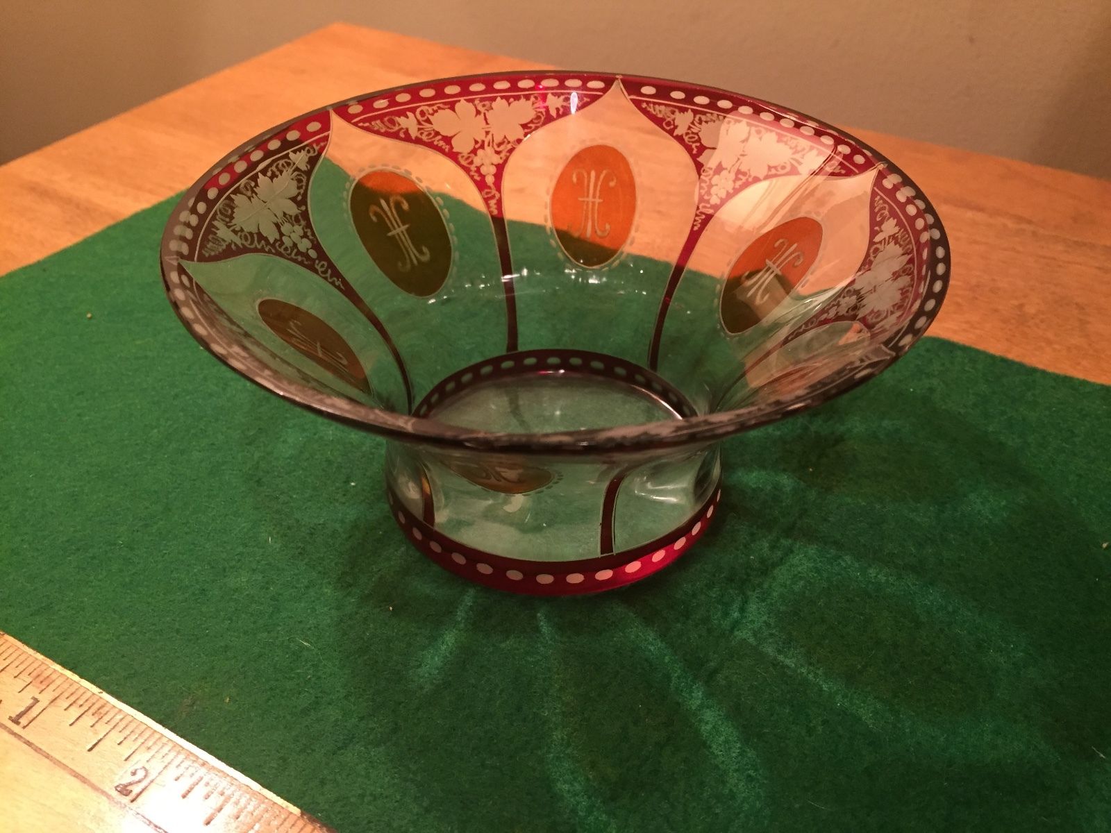 Title (ebay affiliate link): Lovely Etched Decorated Footed Glass Side Dish/bowl-cranberry red floral design
