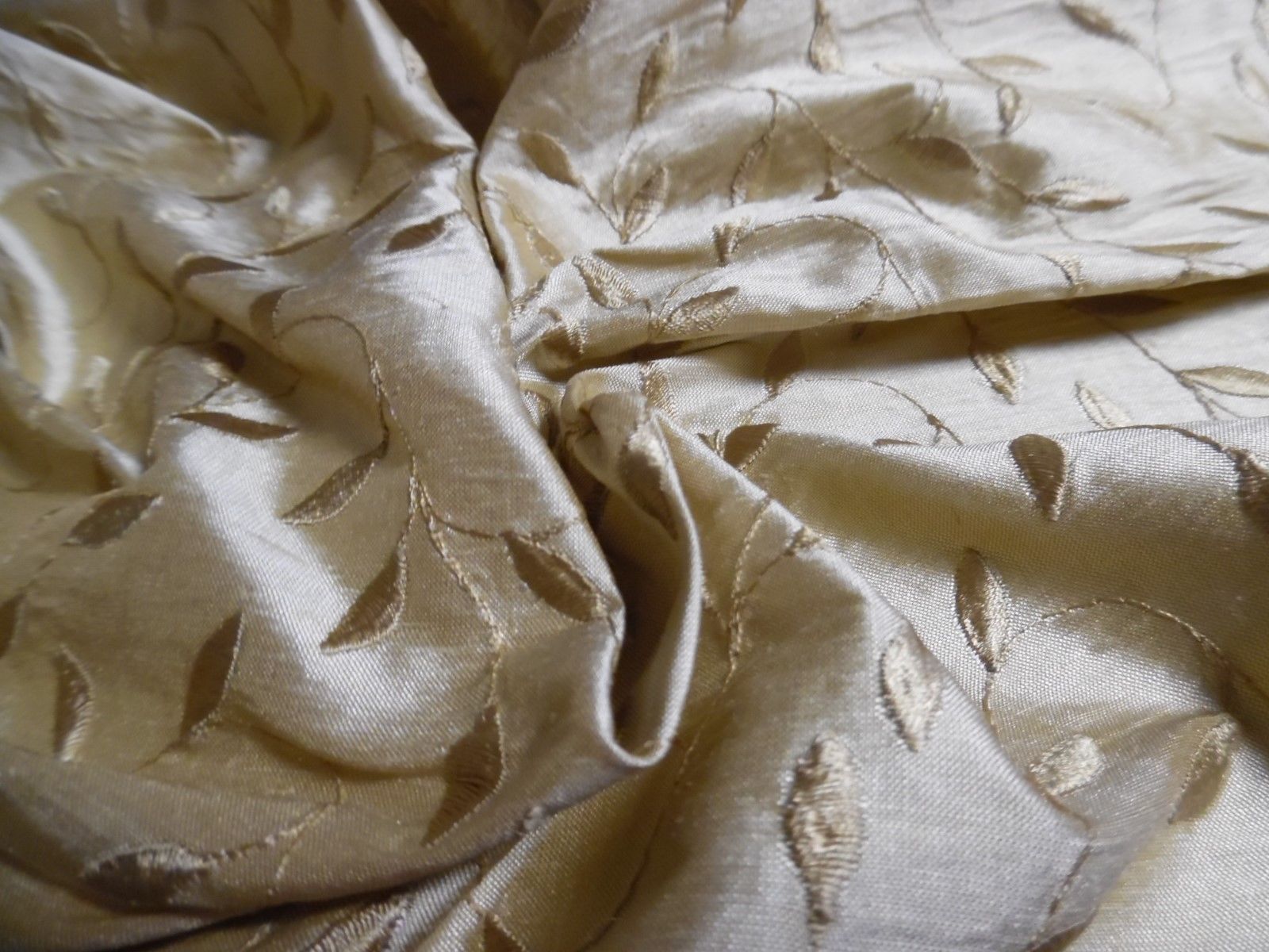 Title (ebay affiliate link): EMBROIDERED SILK~GOLD~SMALL LEAF PRINT~ANTIQUE DOLL DRESS~MILLINERY~7"x44"