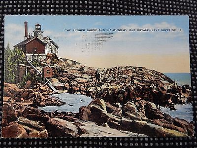VINTAGE POST CARD RUGGED SHORE AND LIGHT HOUSE ISLE ROYALE LAEK SUPERIOR