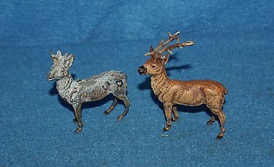Antique 2 German Lead Deer Stag Buck Painted Metal Reindeer w/Antlers
