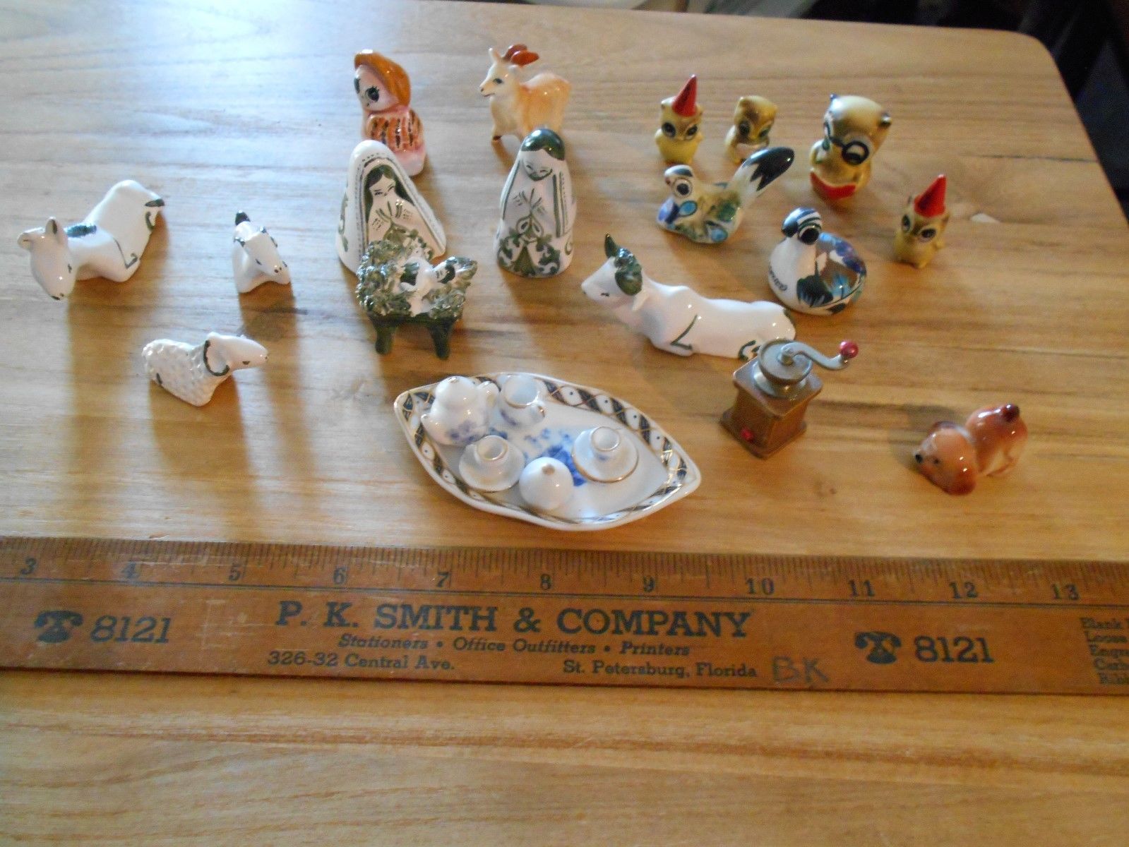 Lot of Miniatures: Tea Set, Birds, Nativity, Owls, Dog, & more