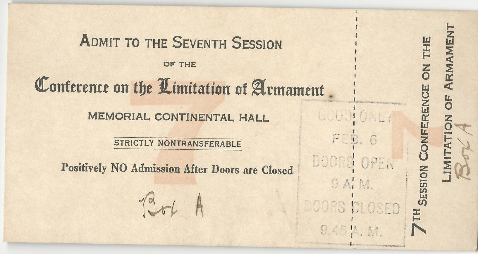 Unused Ticket 7th Session Disarmament Conference Sponsored by Warren Harding