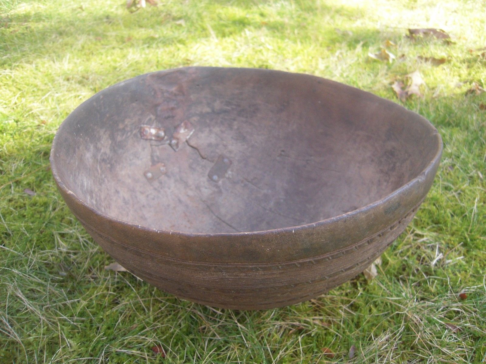 Title (ebay affiliate link): Old 11+" Wood Bowl with Incised Designs Old Metal Repairs