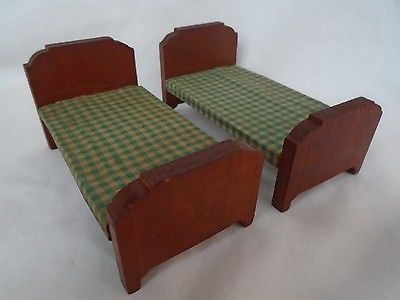 Title (ebay affiliate link): vintage primitive antique wood miniature toy doll house twin beds check fabric