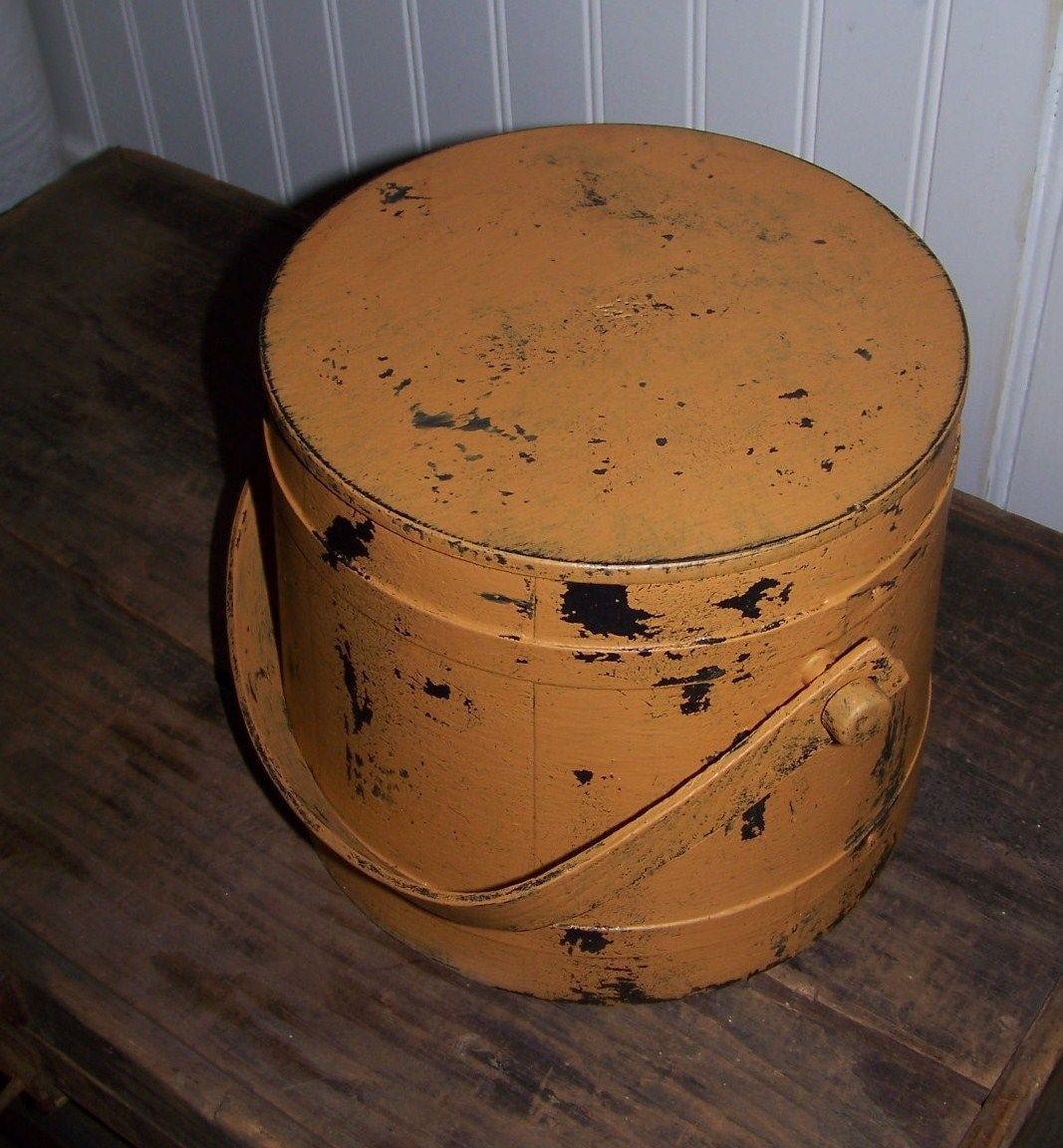Title (ebay affiliate link): Primitive Painted Firkin Sugar Bucket w/ swing handle & metal bands Canted Sides
