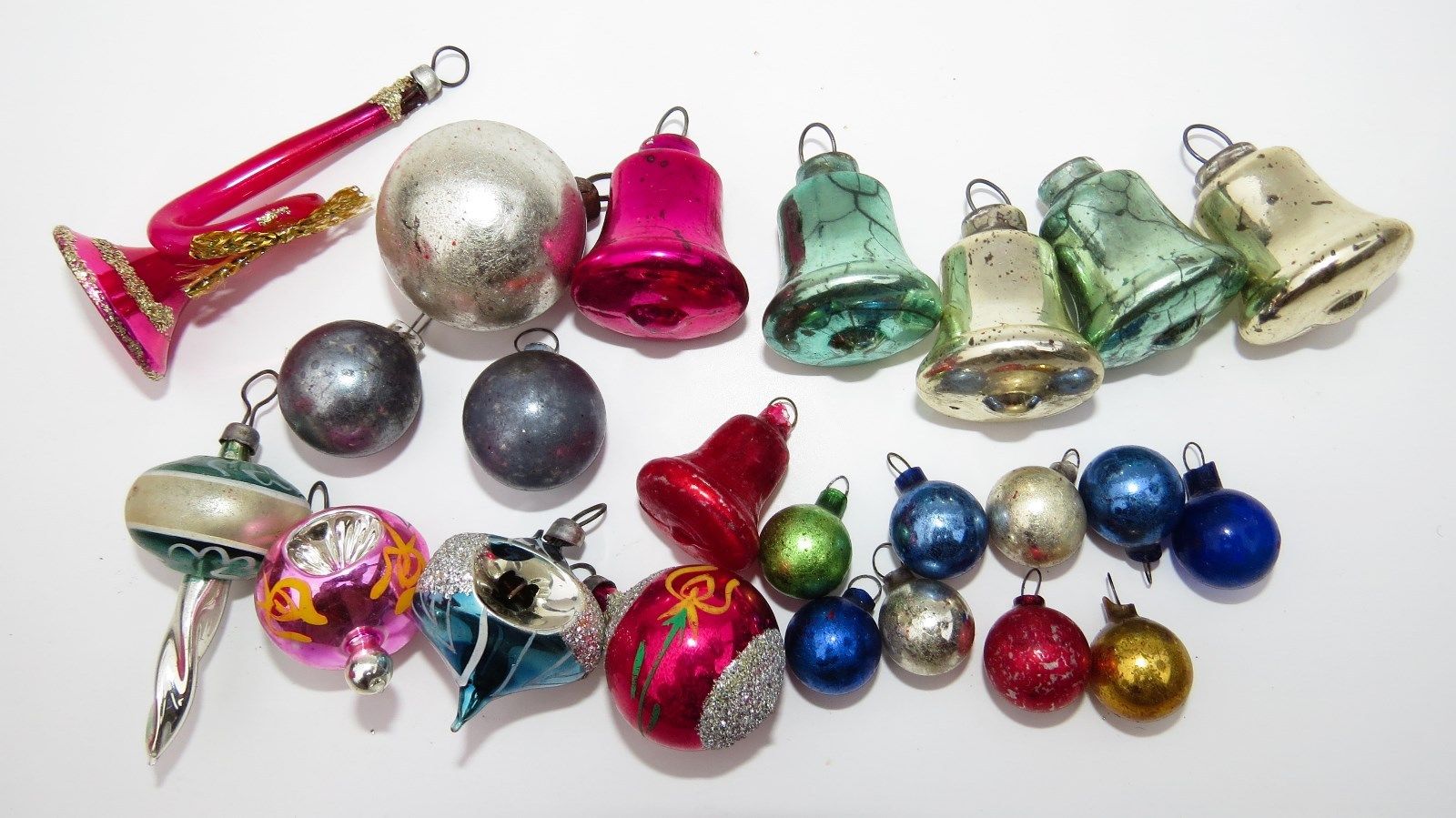 Title (ebay affiliate link): VTG 23 Antique Tiny Christmas Glass Ornaments Old Feather Tree Bell Horn Lot