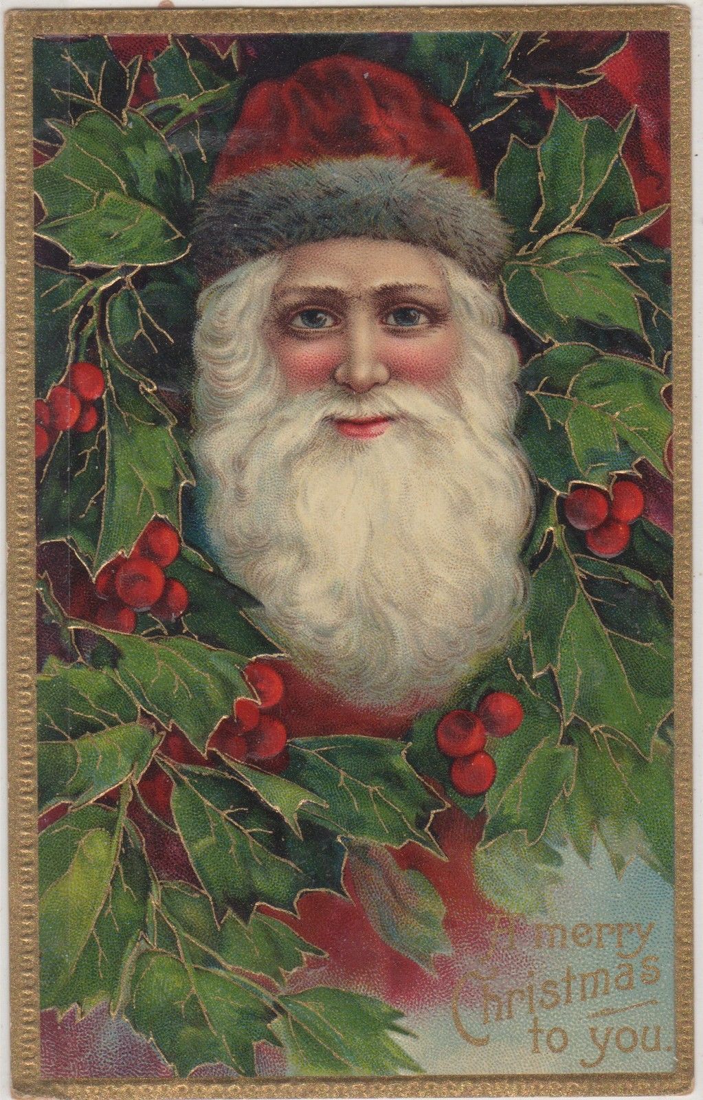 CHRISTMAS POST CARD, ANOTHER CLOSE UP OF SANTA IN RED FUR TRIMMED CAP, COLORFUL